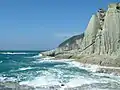 These natural wave-eroded formations are made from green volcanic tuff, with a height of approximately 90 metres (300 ft) and extend for a 1.5 kilometres (0.93 mi) stretch of coastline in the village of Sai, Aomori Prefecture. Individual features have been named for figures in Buddhist theology, and were popularised by the poet and mountaineer Omachi Keigetsu (1869-1925) after his visit in September 1922, although the area had been well-known since the Edo period at part of the pilgrimage route to Mount Osore.
