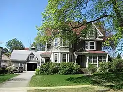 The 2+1⁄2-story wood-frame house was built c. 1889, and has a combination of Queen Anne and Shingle Style features. Shingled elements include window bays, both projecting and recessed, while the porches are decorated with a clear Queen Anne flair, including arched openings and a floral design in the gable end of the front porch.[2]