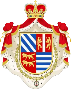 - Art 5 °. The coat of arms used by the aforementioned princes, will be the ancient of his family, with mantle and crown of Prince, and having as support the two rampant wolves of the same shield of his family, granting them by special grace the use of the National Shield in the center of the aforementioned blazon, according to the design that is attached.