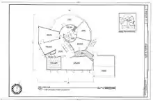 The building is a three-story dodecagon, 42 feet in diameter. It was built using aluminum fascia with vermiculite interior walls. Plate glass walls are the most notable feature of the building. An airplane hangar was included, set four feet lower than the ground floor.[8] When the house was moved to Beverly Shores, the ground floor was modified to make use of the garage and airplane hangar for living space. A carport was added. Windows were modified so that the occupants could open and close them to control the internal environment.[9] The interior is designed around a central staircase in the dodecagonal prism structure. Most rooms are wedge shaped.