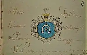 First note about the family comes from 1427 - the son of the knight Wojciech (Wojto vel. Woyto) is written as Wojtowicz. The house was mentioned in 1576 as the Volhynian nobility (while taking part in the coronation parliament of the Polish king, Stephen Báthory).[3] Jan Wojtowicz of Lubicz coat of arms, son of Stefan and Franciszka Załuska, grandson of Stanisław and Teresa Byczkowska, great-grandson of Marcin, proved his nobility in the Łuck County in the territory of Russian partition of Poland in 1803. The Wojtowicz family possessed villages in Volhynia, Podolia, voivodeships: Kiev (Pavoloch), Ruthenian (Wojtowszczyzna, Nienaszow, Draganowa) and Sandomierz (Ulow).