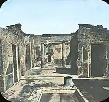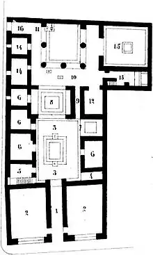 From these main areas extend smaller, private rooms, marking the second section of the house. Along the western wall of the atrium lie a series of cubicula, or bedrooms. Opposite these lie an additional cubiculum, an ala (a service area for a dining room), and an oecus (a small dining area). The northern end of the tablinum opens onto a large, open peristyle, or garden courtyard. To the right of the peristyle sits the drawing room, which, in the House of the Tragic Poet, is believed to have been used as the main dining salon. Adjacent to the drawing room is a small kitchen area. Near the left side of the peristyle, a small back door opens onto an additional street. Finally, into north-western corner of the peristyle is built a small lararium, or shrine to be used in worshipping the Lares Familiares, or family gods. This shrine contained a marble statuette depicting a satyr carrying fruit.[1]