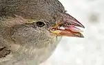 As an adult, the house sparrow mostly feeds on the seeds of grains and weeds, but it is opportunistic and adaptable, and eats whatever foods are available.[109] In towns and cities, it often scavenges for food in garbage containers and congregates in the outdoors of restaurants and other eating establishments to feed on leftover food and crumbs. It can perform complex tasks to obtain food, such as opening automatic doors to enter supermarkets,[110] clinging to hotel walls to watch vacationers on their balconies,[111] and nectar robbing kowhai flowers.[112] In common with many other birds, the house sparrow requires grit to digest the harder items in its diet. Grit can be either stone, often grains of masonry, or the shells of eggs or snails; oblong and rough grains are preferred.[113][114]