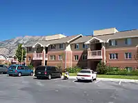 The current complex includes 30 buildings which originally housed married student families, until the end of the summer of 2006, when the southern half of the residential park was converted into housing for singles and eventually the entire complex.[43] In 2013 after the winter semester of school concluded, the northern portion of Wyview was converted into a makeshift Missionary Training Center (MTC) to help alleviate the overburdened Provo MTC just up the hill. As part of this temporary MTC complex, the LDS church also obtained a lease for the Raintree Apartments across the street to the west and both facilities are used together to house missionaries and their training activities.[44] The complex now houses both married and single students.