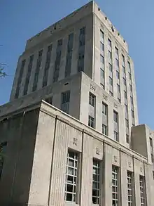 The Houston City Hall building is the headquarters of the City of Houston's municipal government. Constructed during 1938 and 1939, the City Hall complex is located on Bagby Street on the western side of Downtown Houston. It is surrounded by the Houston Skyline District and is similar in design to dozens of other city halls built in the southwest United States during the same time period.[2] City Hall is flanked by Tranquility Park and the Houston Public Library. The simply designed structure featured many construction details that have helped to make this building an architectural classic.