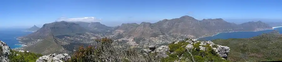 ![]() ![]() ![]() ![]() From top, a view of Hout Bay from Chapman's Peak. Hout Bay beach. Bronze Leopard located in the south access to Hout Bay (left), East Fort Battery, Hout Bay (right). Hout Bay 2014 06.jpg | |