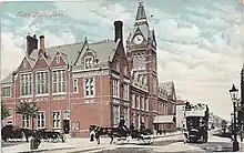 The original town hall in Hove was built by Alfred Waterhouse and opened in 1882. It was built in the gothic style, out of red brick, terracotta and Portland stone, and contained a 2,000 capacity great hall with three balconies, and a 110 feet (34 m) tall tower in the central facade. The building cost around £50,000.[1][2][3][4] The organ was built by Henry Willis, and was sold in 1959.[3] The tower contained 12 bells, and their combined weight made them the hevaiest bells in Southern England in the late 19th century.[5]