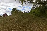 Just north of the parish church are five large burial mounds of which three are called Kungshögar. In Swedish, Kung meaning King and högar, from the Old Norse word haugr, meaning mound or barrow. Hovgården apparently was the location for a royal estate Kungsgård as early as the Viking Age (c. 800-1050 CE). An excavation of one of these royal mounds in 1917 revealed the remains of a wealthy man who lived around 900 CE. He was burned lying in a boat, dressed in expensive clothing but without weapons, accompanied by horses, cows, and dogs.[2]