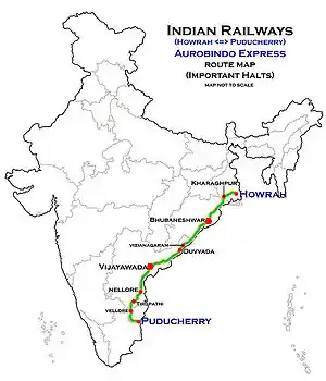 The 12867 / 68 Howrah–Puducherry Express runs from Howrah Junction via Kharagpur Junction, Khurda Road Junction, Visakhapatnam, Vijayawada Junction, Tirupati, Katpadi Junction, Viluppuram Junction to Puducherry.[2]