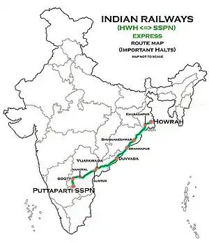 The 22831 / 32 Howrah Junction–Sathya Sai Prasanthi Nilayam Express runs from Howrah Junction via Kharagpur Junction, Khurda Road Junction, Duvvada, Vijayawada Junction, Guntur Junction, Gooty Junction to Sathya Sai Prasanthi Nilayam.