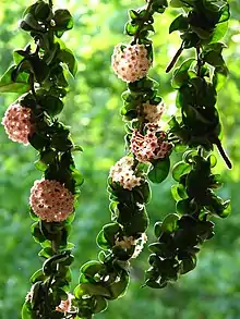Like all species of Hoya, H. carnosa flowers from specialised perennial structures referred to as spurs. These appear from the axils of the leaves and stem; flowers may not be produced when the spurs first appear, but in time buds emerge from the tips. Each season new flowers are produced on these same spurs, so they should not be damaged or removed.