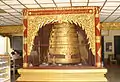 The hti of the Shwedagon Pagoda in Yangon is about one and a half stories tall and contains about half a ton of gold.[11] The hti belongs to the magaik form,[12] and is set with over 5,500 diamonds, 2,300 rubies, sapphires and other gems, and 4,000 golden bells.[11] The older hti, donated by the penultimate King of Burma, Mindon Min, can be seen at a temple inside the middle platform (အလယ်ပစ္စယ or ရင်ပြင်တော်) of the pagoda's compound. Said hti at Shwedagon is a gilt iron-work umbrella, on each of whose many rings hangs multitudes of gold and silver jewelled bells.[13] It was presented by King Mindon Min and placed at a cost of not less than 50,000 British pounds.[13] It was constructed by voluntary labor, using donated money and jewels.[13] The vane and uppermost band are richly studded with jewels from all parts of Burma.[13]