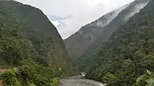 The Huancabamba runs in steep canyons for part of its course and with mountains on either side rising to more than 3,000 metres (9,800 ft) in elevation. A few kilometres of the river above Pozuzo is within the Yanachaga–Chemillén National Park.[4] The river is located in the ecological zone of the Peruvian Yungas, or Ceja de Selva ("eyebrow of the jungle"), the transition zone between the low jungles of the Amazon Basin and the Andes highlands.[5]