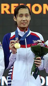 Huang Yun-wen (Chinese: 黃韻文; pinyin: Huáng Yùnwén; born 4 November 1994) is a Taiwanese taekwondo practitioner.[1] She claimed a silver medal at the 2014 Asian Taekwondo Championships, and a gold medal at 2014 Asian Games.[2][3] In both competitions, she matched up against South Korea's Yoon Jeong-yeon.[4]