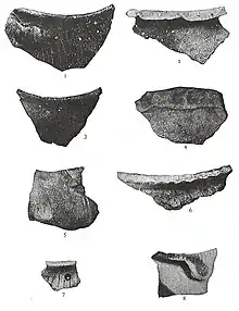 18 different rim profile types were identified but almost all of them are everted, mostly sharply everted. The most common are everted with square lip; everted with the lip thickened on either the inside or outside; and everted with pointed lip. Almost half of the lips are unnotched. Of the body sherds showing incised lines, there were more fine-line incised lines than either medium- or wide-line.[1]