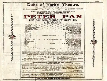Willis appeared in the copyright performance of William Gillette's play Sherlock Holmes (1899) in an unknown role. He played Planchette and Lavrille in Never Again at the Vaudeville Theatre (1897) opposite Allan Aynesworth;[2] Captain Welsh opposite Robert Taber in Bonnie Dundee at the Adelphi Theatre (1900);[3] Brother Jerome in The Sacrament of Judas at the Comedy Theatre (1901);[4] Rushey Platt, MP in Love in Idleness at Terry's Theatre (1902);[5] Dick Snaresby in Brown at Brighton at the Avenue Theatre (1903);[6] Mullins in the original stage production of Peter Pan at the Duke of York's Theatre (1904) opposite Gerald du Maurier as Captain Hook/Mr. Darling and Nina Boucicault as Peter Pan;[7] Jenkins in Castles in Spain at the Royalty Theatre (1906);[8] Dubois in The Hon'ble Phil opposite G. P. Huntley at Hicks Theatre (1908);[9] Mr. Curry in The Test at the Court Theatre (1906).[10] and Village Handyman in The Man with his Back to the East at the Court Theatre (1912).[11]
