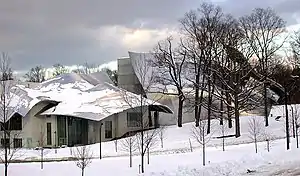 The swooping forms stretch out far beyond the auditorium on three sides and create a profile for the building that gently echoes the Catskill Mountains in the distance, across the Hudson.