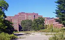 Demolition began on July 13, 2016 when smaller auxiliary buildings were torn down.[29] The heavy vegetation that mostly hid the property from plain sight was cleared in summer 2019.[30] The demolition of Ryon Hall, on the extreme southern end of the property, began on October 14, 2019. As part of the mixed use site, the "Kirkbride" main administration building, library, amusement hall, chapel, and the northernmost tower of the north wing will be preserved and put in to adaptive reuse. Also, the Great Lawn will be preserved. As of May 25, 2020, the fate of the other buildings on the North Campus is still unwritten and may be added for future use.