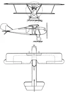 The Petrel was a biplane with thick section, fabric covered, rectangular plan wings built around twin ply spars. The lower wing was both shorter and narrower and the upper wing carried overhung ailerons reminiscent of the Fokker D.VII. The struttage was also similar to that of the Fokker, with outward-leaning N-struts outboard and pairs of rearward and outward-leaning short struts from the upper and lower fuselage on each side.[1][2]