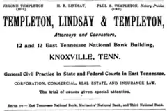 During the 20th century, Lindsay practiced as a senior partner in various law firms, including Templeton, Lindsay and Templeton; Lindsay, Young and Smith; Lindsay, Young, Smith and Donaldson; and Lindsay, Young and Atkins.[1] He worked as counsel for the Southern Appalachian Coal Operators Association, helping numerous regional coal companies incorporate. In the early 1900s, he helped Knoxville-based contractor William J. Oliver win a large settlement in a case against the federal government. Oliver had been the low bidder on the contract to build the Panama Canal in 1907, and sued when the administration of President Theodore Roosevelt rejected his bid, arguing he lacked the experience for the project.[1][7]