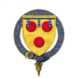 Although Vivian (1895)[4] and Richardson (2011) and others suggest that the Sir "Hugh Courtenay" who was one of the founding members of the Order of the Garter was Hugh Courtenay, 10th Earl of Devon (1303–1377),[5] Complete Peerage,[6] follows Beltz, who correctly states that the founding member was the 10th Earl's eldest son and heir apparent, Sir Hugh Courtenay (died 1349), the subject of this article, citing the latter's service in France in 1346, his presence at the siege of Calais in 1347 in the company of his uncle, William de Bohun, 1st Earl of Northampton (died 1360), and his prowess at a tournament at Eltham Palace later that year in which he received from the King, 'as his guerdon, a hood of white cloth, buttoned with large pearls, and embroidered with figures of men in dancing postures'. Beltz also notes more pertinently that William de Bohun, 1st Earl of Northampton (c. 1310 – 1360) succeeded to Sir Hugh Courtenay's stall at Windsor, and since Northampton died in 1360, while Hugh Courtenay, 10th Earl of Devon, lived until 1377, Northampton could not have been successor to the 10th Earl of Devon in the Order of the Garter, and must therefore have been successor to Sir Hugh Courtenay, the 10th Earl of Devon's son, who died in 1348.[7]