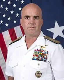 Howard graduated from the Naval Academy in 1990 and received a commission as an Ensign in the United States Navy. He volunteered for Basic Underwater Demolition/SEAL training at Naval Amphibious Base Coronado and graduated with BUD/S class 172 in February 1991.[5] His first operational assignment was with SEAL Team EIGHT at Naval Amphibious Base Little Creek. Following SEAL Tactical Training (STT) and completion of six month probationary period, he received the 1130 designator as a Naval Special Warfare Officer, entitled to wear the Special Warfare insignia also known as "SEAL Trident". In 1998, Howard volunteered for assignment to Naval Special Warfare Development Group (commonly known as DEVGRU or SEAL Team Six), in Damneck, Virginia and completed a specialized selection and training course. He then served with the command as troop commander, squadron operations officer until 2003 during which time he planned, rehearsed and operated during classified exercises and operations. Howard served with JSOC as operations officer in 2005. Howard later returned to DEVGRU in 2006 as squadron commander of Red Squadron till 2009. At DEVGRU he also held numerous leadership positions including squadron operations officer, deputy commanding officer and commanding officer of Naval Special Warfare Development Group from 2011-2013. Howard earned a Master of Arts degree at the Naval War College in 2010. He recently commanded Special Operations Command Central, MacDill Air Force Base, Florida from 2018 to 2020 following assignment as assistant commander, Joint Special Operations Command, Fort Bragg, North Carolina from 2016 to 2018. Howard’s awards include the Silver Star, four Bronze Stars with Combat Distinguishing Device, six Defense Superior Service Medals, three Legions of Merit, the Navy Combat Actions Ribbon, five Presidential Unit Citations, and four Joint Meritorious Unit Awards.