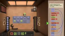 The player uses simple commands to create a list of instructions to perform the given task. Such commands include picking up the first item at the inbox, placing the item the avatar is currently carrying at the outbox, copying the carried item to a marked square, performing addition or subtraction of the carried item with the item at the marked square, and making decisions based on the value of the carried item such as if it is zero or negative. As such, these mimic the elements of assembly language: the simple instructions equivalent to opcodes, the ability of the avatar to hold an item mirroring a processor register, and the spaces on the office floor representing main memory. Later, the player gains the ability to use the concept of memory addresses, in which they can direct instructions to operate on a specific floor space that is labeled with the number of a different floor space. The visual approach to the language also allows the player to place simple handdrawn notes as labels in both the list of instructions or to label floor spaces for clarity. The loops and jump commands are also marked with arrows to help the player identify the logic flow. Once they have created the program, they can run it through, increasing the speed for longer programs, or pause and move step by step for debugging purposes. If the outbox received any boxes it is not expected for that program, the program will immediately terminate and the player will need to figure out how to correct it. Though the player will be only be shown their list of instructions operation on one set of input and the expected output, the game will also test the list against other randomized sets of input and output, and will alert the player if any of these also fail. The player can receive a reminder of their puzzle task and an example of what type of output it should produce from a supervisor character that watches their avatar work, and the player can also gain hints on how to solve some programs.