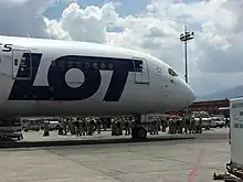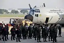 The Indian Air Force evacuated over 500 citizens from Nepal between 25 and 26 April, and hundreds later on 26 April.[17][18] Ten flights were scheduled for 26 April, which airlifted army forward hospitals, teams of doctors, nurses, and paramedics, engineering task forces, water, food, National Disaster Response Force teams, medical personnel and equipment, blankets, stretchers, and tents.[19][20]