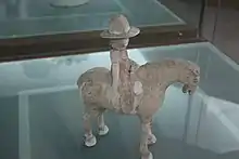 Humao (Chinese: 胡帽; lit. 'Barbarian hat') is a type of brim hat which was used in the Tang dynasty by both Chinese men and women when horse-riding.[1]: 54 Women of all social ranks (ranging from palace ladies to commoners) wore humao when horse-riding since the beginning of the Kaiyuan period (713–741 AD),[2]: 311 during the Mid-Tang dynasty.[3]: 220 The humao was a type of veil-less hat (which contrasted to the weimao); therefore, it allowed for the faces and hair to be exposed.[2]: 311 [3]: 220