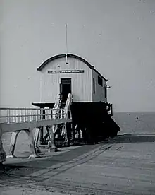 The lifeboat is moored at the end of a pier that sets out into the Humber Estuary (westwards from Spurn Head) rather than a traditional launch down a ramp into the sea (which is on the eastern side of Spurn Head). This location has been described as being in the lee of bad weather, thereby providing a safer place to set off from.[23] The crew have pushbikes to cycle down to the end of the pier and then use a boarding boat to get to the lifeboat.[24] Despite some buildings being erected to launch the lifeboat, even from the early days, it was recognised of the difficulties in launching the boat from land, so it has been traditionally moored away from the coastline.[25] A traditional lifeboat house with slipway was built in 1923 and used up until 1977, but it fell into disuse with bigger ships arriving that were better moored afloat. The slipway and lifeboat house were demolished in 1995.[9]