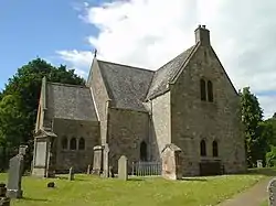The church is surrounded by an ancient graveyard, still in use today, and described as resassuring a place to be buried as you could wish for...deep in the woods with the burn [river] besides.[5] Some of the still legible gravestones show dates from as early as the 17th century.