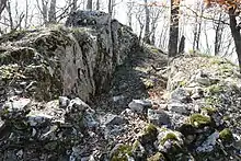 However, another partisan, Michael Rosd, successfully defended the castle of Füzér in Újvár County and another nearby fort called "Temethyn" with a few guards, while also resisting various attempts at bribery.[63] "Temethyn" was referred to as the property of the Rosd kindred, and former historiography identified it with Temetvény Castle in Nyitra County (present-day Hrádok, Slovakia).[54] However, there are no other known landholdings of the Rosds in Nyitra County. Since they had a relatively modest fortune, as their social ascension occurred only during the reign of Stephen after 1270, their wealth could not have been enough to allow them to build a castle. Moreover, the two castles lay at an insurmountable distance from each other, which would make simultaneous protection impossible. Zsoldos identified "Temethyn", consisting of ditches and ramparts, with a recently excavated fortified outpost at the top of the Őrhegy ("Guard Hill") about one kilometre from the caste of Füzér (The word "temetvény" originally meant "embankment"). Following his success, Michael Rosd later joined Stephen's army.[64]