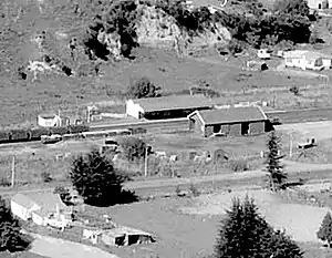 Goods were first carried to the station on 19 October 1887,[3] though the official opening of the 15 mi 57 ch (25.3 km) Marton to Hunterville section wasn't until Saturday 2 June 1888, when the station was served by two trains a week,[4] reported as losing £15 a week.[5] A Certificate of Inspection for the line was issued on Wednesday, 6 June 1888.[4] Hunterville closed on 13 October 1986, though the passing loop was retained.[6] A platform also remains.[7]