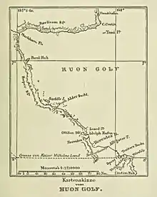 Huon Gulf is a large gulf in eastern Papua New Guinea. It is bordered by Huon Peninsula in the north. Both are named after French explorer Jean-Michel Huon de Kermadec. Huon Gulf is a part of the Solomon Sea. Its northern boundary is marked by Cape Cretin, southern by Cape Longerue. The coast, which quickly increases in elevation from the beach, is bordered by the Rawlinson Range to the north and the Kuper Range to the west, which rises to about 600 m (2,000 ft). Lae, capital of the Morobe Province, is located on the northern coast of the gulf.