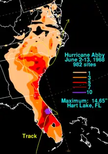 Abby dropped 4–8 inches (102–203 mm) of rain across southern and western Florida. The highest rainfall total was 14.65 inches (372 mm) in Hart Lake.[16] On the Florida Panhandle, rainfall up to 2 inches (50.8 mm) was reported. Gusts went as high as 87 knots at the 60-ft Tower. Four tornadoes were reported during Abby's landfall. Two of which caused $8,000 dollars (1968 USD) in damage in Florida. Six fatalities resulted from drowning, electrocutions and traffic accidents were reported during the storms landfall. In all, damage in Florida by Abby amounted to $250,000 (1968 USD). The rainfall was beneficial in Florida, as it aided in ending a drought in the state.[1] Two tornadoes in Florida were spawned in association with Abby, both on June 4. One was near the Indian River in Brevard County at 6:30 pm EDT. No injuries were reported and damage was estimated at less than $5,000 worth of damage. The second tornado touched down in Polk County at around 9:30 pm EDT. It resulted in no injuries and caused less than $500 dollars in damage. A funnel cloud was observed at Cape Kennedy around 8:10 am, but it never touched the ground.[17]