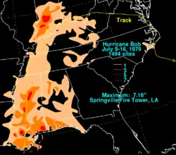 Hurricane Bob also produced a widespread area of rain that was heavy in localized areas.[11] Rainfall associated with the hurricane peaked at 7.16 in (182 mm) in Louisiana, where the storm made landfall. Statewide rainfall totals peaked at 6.64 and 4.81 in (169 and 122 mm) in Pascagoula, Mississippi and Robertsdale, Alabama, respectively.[12] Further inland, the remnants of Bob dropped heavy rainfall in the Midwestern United States, peaking at 5.72 in (145 mm) at a station in Indiana University Bloomington.[13] In addition to the strong winds and heavy rain, Bob produced eight tornadoes across the southern United States. One of these tornadoes caused $27,500 in damage after striking areas of Biloxi, Mississippi.[2] Another tornado impacted areas near Red Level, Alabama destroying or damaging several buildings and uprooting trees.[9] Overall, Hurricane Bob caused approximately $20 million in damage. However, $15 million in damage resulted from flooding in Indiana, with the rest of the storm's monetary impacts arising from coastal regions.[5]