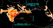 The outer bands of Ella produced gale force winds in the Florida Keys, causing damage mainly to antennas, fences, shrubbery, and signs. Winds on Stock Island damaged and overturned 4 trailers. Further north in Miami, a freighter was disabled and had to be towed in to port by the United States Coast Guard.[1] Due to fears of a storm similar to Hurricane Audrey in the previous year, some residents evacuated southwestern Louisiana. An estimated 1,500 fled inland as Ella approached, leaving only 100 people to ride out the storm.[9] In Louisiana, squalls from Ella caused the collision of two ocean-bound freighters along the Mississippi River near New Orleans.[10] Impact elsewhere in Louisiana was limited to minor damage to rice crops in the southwestern portion of the state.[3] On 35 oil platforms offshore of Houston, Texas, 1,400 people were alerted about possible evacuations if Ella were to approach the area.[11] Along the coast, there were evacuations in Indianola, Port Alto, Port O'Connor, and Sabine Pass.[12] Ella brought heavy rains to eastern and southern Texas, including 13.1 in (330 mm) in Galveston.[13] Precipitation brought minor flooding to low-lying areas of the Bolivar Peninsula, Galveston Island, Kemah, La Marque, the Matagorda Peninsula, Seabrook, and Texas City.[14] Ella also brought swells to the coast of Texas. A portion of Texas State Highway 87 was closed due to inundation between Sabine Pass and High Island. Further south, tidal flooding along Texas State Highway 316 caused the closure of the portion near Indianola. Offshore, a 65 ft (20 m) shrimp trawler sank during the storm, after being smashed against the rocks near Galveston. The crew fled to the life boats and were later rescued by a United States Coast Guard Patrol Vessel. The captain of the snapper boat E. W. Fowler went missing after he was washed overboard; the man was later presumed to have drowned.[12]