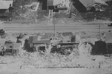 The storm caused severe beach erosion in Bay County; approximately 801,000 cubic yards (612,000 m3) of sand was removed.[16] Storm-related changes in the coastal topography resulted in extensive structural damage in the Panama City Beach area. The most severe damage was concentrated in a 22 miles (35 km) area of the shore east of the hurricane's eye, and storm surge peaked in intensity for no more than a half hour according to preliminary estimates. Much of the resultant damage came as a result of foundation undermining, which was compared to that of the New England hurricane of 1938. Although Eloise was not abnormally strong, the geographicy setting and building standards in the area were blamed for the destruction of many homes and businesses.[17] Monetary losses from property damage in Panama City Beach alone totaled about $50 million.[18]