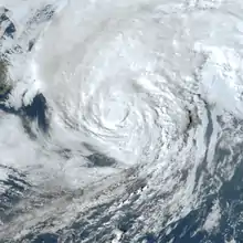 Just three hours later, Epsilon reached Category 3 major hurricane status, while displaying a well-organized satellite presentation. A warm, well-defined eye was evident, with closed eyewall convection, and cloud top temperatures of around -76 °F (-60 °C).[21] The upgrade to a Category 3 hurricane made Epsilon the easternmost major hurricane recorded this late in the calendar year, as well as the strongest late-season major hurricane in the northeastern Atlantic, and the fastest rapid intensification rate of a tropical cyclone recorded this far northeast this late in the Atlantic hurricane season.[2] At 00:00 UTC on October 22, Epsilon reached its peak intensity, with 1-minute sustained winds of around 115 mph (185 km/h) and a minimum central pressure of around 952 mbar (28.11 inHg). Meanwhile, the hurricane's small and well-defined inner core was located within an environment of deep-level moisture, protecting it from dry air associated with an upper-level trough wrapping three-quarters of the way around the hurricane.[4] Shortly afterward, Epsilon began to degrade due to a dry air intrusion, and its eye started to become ill-defined and cloud-filled, while its western eyewall eroded, causing the storm to weaken to a Category 2 hurricane.[22] Weakening ensued throughout the day, further degrading Epsilon to a 85 mph (135 km/h)-Category 1 hurricane before the weakening trend stopped, with the storm maintaining this intensity for about 48 hours. However, the eye briefly became better-defined, before becoming ill-defined once more just a few hours later. Meanwhile, the CDO became disorganized, with a broad outer band wrapping around the western portion of the storm. However, upper-level outflow was well-defined in the northern part of the hurricane.[23][24][4] Around this time, Epsilon made its closest approach to Bermuda, passing just 190 miles (305 km) east of the island.[25] At 15:00 UTC on October 23, a small eye reappeared on geostationary and polar-orbiting microwave imagery, along with increased well-defined curved banding.[26] Concentric eyewalls began to develop within Epsilon, while the northern half of its wind field expanded, indicating the start of an eyewall replacement cycle.[27] Several hours later, early on October 24, Epsilon completed its eyewall replacement cycle. The storm's convective pattern devolved into a large, comma-shaped structure, rather than the classical circular structure normally seen in mature tropical cyclones.[28] During this time, Epsilon moved over the warm waters of the Gulf Stream, which allowed it to retain its intensity. A buoy near the center of the hurricane indicated that Epsilon's central pressure was about 957.8 millibars (28.28 inHg) around this time, which indicated that Epsilon was a stronger hurricane than the NHC had estimated it to be earlier.[29]