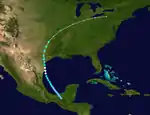 A tropical depression developed in the Pacific Ocean while located about 105 mi (165 km) west-southwest of Tapachula, Chiapas, on October 3. The depression moved slowly north-northwestward and made landfall in a rural area of southeastern Oaxaca early the next day. On October 5, the system reached the Gulf of Mexico and soon intensified into a tropical storm. Thereafter, it curved east-northeastward and strengthened into a Category 1 hurricane by October 6. Early the next day, the storm became a Category 2 hurricane and peaked with maximum sustained winds of 105 mph (165 km/h) and a minimum barometric pressure of 970 mbar (29 inHg).[3]