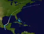 In June, a low-pressure area was observed over the western Caribbean.[2] At 12:00 UTC on June 12, a tropical depression developed about 20 mi (30 km) north of Swan Island, Honduras. The depression moved north-northeastward and intensified into a tropical storm early the next day. Later on June 13, the storm made landfall in modern-day Artemisa Province of Cuba with winds of 45 mph (70 km/h). After reaching the Gulf of Mexico late on June 13, the system continued to strengthen and peaked with maximum sustained winds of 60 mph (95 km/h). Around 23:00 UTC, it made landfall near Steinhatchee, Florida, at the same intensity.[3]