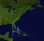 The final storm developed north of Puerto Rico at 00:00 UTC on November 1 as a tropical depression. Initially, it headed northwestward, but re-curved to the northeast about six hours later. By midday on November 1, the depression strengthened into a tropical storm. The storm continued to intensify and peaked with sustained winds of 70 mph (110 km/h) early on November 3.[3] Around that time, a ship observed a barometric pressure of 993 mbar (29.3 inHg), possibly suggesting hurricane intensity.[2] Later on November 5, the storm began heading in a more eastward direction and weakened. At 06:00 UTC the next day, it weakened to a tropical depression and dissipated several hours later, while located about 760 mi (1,225 km) southeast of Cape Race, Newfoundland.[3]