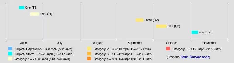 Of the season's five tropical cyclones, three reached hurricane status. However, none of them strengthened into major hurricanes, which are Category 3 or higher on the modern-day Saffir–Simpson hurricane wind scale. Along with 1901, this was the first time that two consecutive seasons lacked a major hurricane since 1864 and 1865.[1] Only one storm left significant impact, which was the second hurricane. It brought flooding and strong winds to Texas, resulting in severe damage in some areas. A tornado spawned by the storm also caused five fatalities.