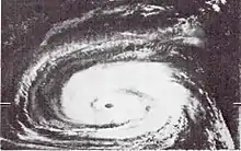 Early on September 17, the storm began to rapidly intensify. By 1800 UTC, Gladys attained its peak intensity with maximum sustained winds of 145 mph (230 km/h) and a minimum barometric pressure of 945 mbar (27.9 inHg). The storm later began to weaken and fell to a Category 3 hurricane early on September 19. Around that time, Gladys curved northward in response to a weak trough in the westerlies.[3] Early on September 20, it further weakened to a Category 2 hurricane.[2] Rising atmospheric pressures to the north forced the storm to curve northwestward on September 21.[3] Later that day, Gladys weakened to a Category 1 hurricane. [2] The storm posed a threat to the East Coast of the United States, and passed about 140 miles (230 km) east of Cape Hatteras, North Carolina, before a deepening low pressure area over the Great Lakes region caused it to veer northeastward.[3] Gladys then accelerated and approached Atlantic Canada, before transitioning into an extratropical cyclone at 0000 UTC on September 25, while located between Nova Scotia and Sable Island. The extratropical remnants continued northeastward into Newfoundland and dissipated later on September 25.[2]