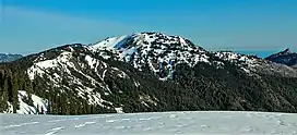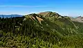 From the end of the Hurricane Ridge Road, a 1.6-mile trail leads to the top of Hurricane Hill. This paved trail was originally a Forest Service road built in the 1930s by the Civilian Conservation Corps.[7] The relatively easy and popular hike gains approximately 750 feet of elevation and is snow-free from late June to October.[8] The trail was refurbished in 2020.[9] In winter, Hurricane Hill becomes a favorite destination with snowshoers.[10] There is also a six-mile trail on the west side which climbs up from the Elwha Valley and gains 5,100 feet of elevation.[11] From the north side, the Little River Trail climbs 4,700 feet over seven miles before intersecting with the paved Hurricane Hill trail. The summit offers views of the Bailey Range, Mount Olympus, Victoria on Vancouver Island across the Strait of Juan de Fuca, and on clear days one can see Mount Baker 95 miles distant. Hurricane Hill is considered one of the best wildflower hikes in Washington state with over 125 species of plants, with the peak time for wildflowers in July and August.[12]