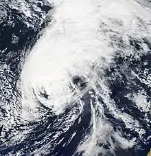 Lorenzo's peak was short-lived because of increasing wind shear, cooler waters, and an intrusion of dry air; the hurricane lost its Category 5 status 3 hours after peak intensity, and weakened faster than it had strengthened.[2] By 18:00 UTC, only 15 hours after peak intensity, it had weakened below major hurricane strength.[2] The hurricane's large size caused it to upwell cool water. Early on October 2, Lorenzo began extratropical transition, passing west of Flores Island. By this time, it had weakened to a Category 1 hurricane, but still brought hurricane-force winds to the islands.[2] Lorenzo became fully extratropical by 12:00 UTC on 2 October.[2] The extratropical cyclone continued moving quickly northeastward, maintaining an expansive wind field, which resulted in an extended period of gale-force winds for Ireland. On 4 October, Lorenzo's remnant made landfall on Ireland, and the low-level circulation center of the cyclone became ill-defined shortly thereafter.[2] However, Lorenzo's extratropical remnant persisted for another few days, with the storm moving southeastward, moving over Germany on 5 October.[6] Afterward, Lorenzo's remnant continued its southeastward motion while gradually weakening, before dissipating over Romania on 7 October.[7][8]