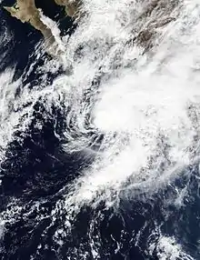 On November 27, Sandra produced wind gusts up to 40 mph (65 km/h) on Socorro Island as the storm moved 115 mi (185 km) southeast of the island. Effects from Sandra were minor and limited due to its dissipation offshore; rainfall was limited to 1 to 3 in (25 to 76 mm) in most areas and largely considered beneficial.[1] In contrast to predictions of 3.0 to 5.9 in (75 to 150 mm) of rain across Baja California Sur, only 0.71 in (18 mm) fell in San José del Cabo while other areas of the Los Cabos Municipality received a trace to no accumulation.[30] Wet roads in Cabo San Lucas resulted in two accidents that left three people injured.[31] In Chihuahua, minor landslides damaged roads.[32][33]