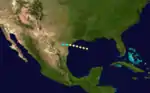 By August 16, a strong hurricane was located in the northwestern Gulf of Mexico south of Louisiana. With estimated winds of 105 mph (165 km/h), it tracked westward and struck Texas on Matagorda Island before passing near Refugio. The hurricane quickly weakened over land and dissipated late on August 17.[4] Damage from the hurricane was heaviest in Refugio and Indianola. In the latter city, strong waves damaged wharves and boats while the storm surge flooded the streets with about 1 ft (0.30 m) of water. Intense winds knocked down several houses as well as a church, and many buildings lost their roofs. In Sabine Pass, the winds ruined a variety of fruit crops.[6]
