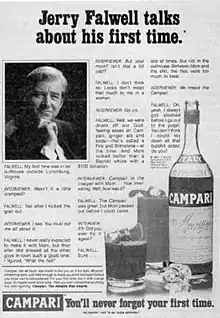 The Hustler parody, created by writer Terry Abrahamson and art director Mike Salisbury,[5] included a headshot photo of Falwell and the transcript of a spoof interview, where, misunderstanding the interviewer's question about his "first time", "Falwell" casually shares details about his first sexual encounter, an incestuous rendezvous with his mother in the family outhouse while they were both "drunk off our God-fearing asses on Campari." In the spoof interview, "Falwell" goes on to say that he was so intoxicated that "Mom looked better than a Baptist whore with a $100 donation," and that he decided to have sex with her because she had "showed all the other guys in town such a good time." When the interviewer asked if Falwell ever tried "it" again, once again mistaking the interviewer's intention, "Falwell" responded, "Sure ... lots of times. But not in the outhouse. Between mom and the shit, the flies were too much to bear." Finally, the interviewer clarifies that he's asking if Falwell had tried Campari again, "Falwell" answered, "I always get sloshed before I go out to the pulpit. You don’t think I could lay down all that bullshit sober, do you?"[6]