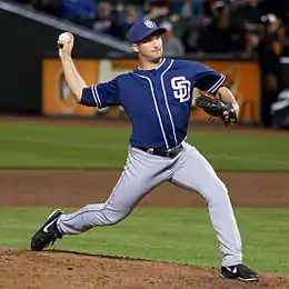 Street was traded by the Rockies to the San Diego Padres for left hander Nick Schmidt on December 7, 2011. The Padres picked up all but $500,000 of Street's remaining contract,[15] and he moved immediately into the closer role vacated by Heath Bell. Street missed a month with a right shoulder strain,[16] but otherwise had an excellent first half with the Padres. He compiled a 1.13 ERA, was 13 for 13 in converting save opportunities, and did not allow a home run in his 25 games, earning a selection to his first All-Star Game.[17] On July 29, 2012, the Padres and Street agreed to terms on a two-year contract extension with a club option for the 2015 season.[18]
